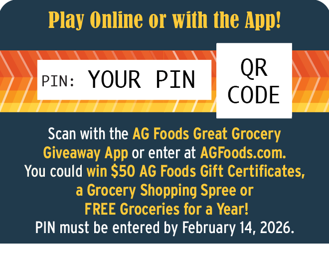 Bonus PINs can be found on our AG Foods Facebook page throughout the contest. You can enter them here for entries into the online draws!